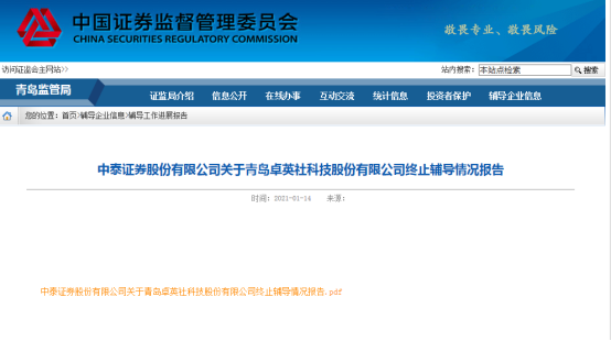 14日,中泰证券股份有限公司(以下简称“中泰证券”)于青岛监管局发布关于青岛卓英社科技股份有限公司(以下简称“卓英社科技”)终止辅导情况报告。