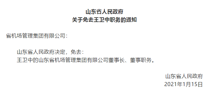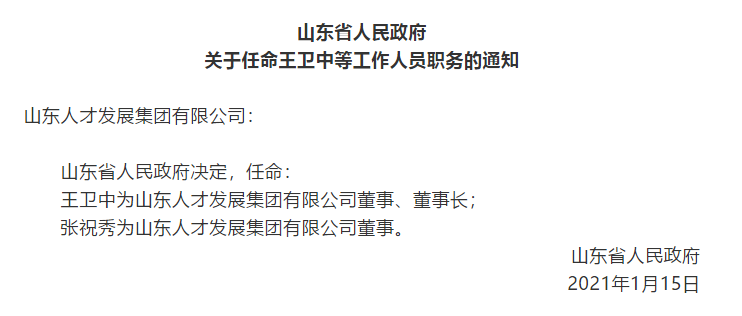 15日,山东省政府网站发布一批人事任免。鲁网·泰山财经记者获悉,原山东省机场管理集团有限公司董事长王卫中出任山东人才发展集团有限公司董事、董事长。