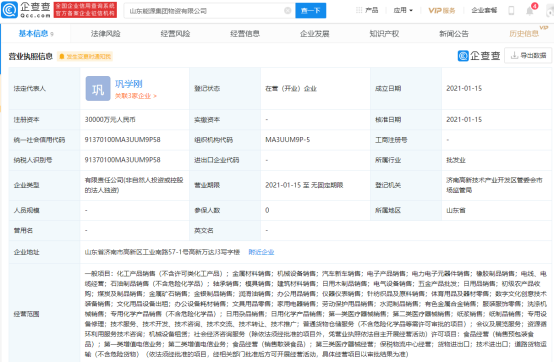 企查查显示,1月15日山东能源集团物资有限公司成立,注册资本3亿元人民币,法定代表人为巩学刚,经营范围包含化工产品销售;汽车新车销售;第一类增值电信业务;第二类增值电信业务;食品经营;第三类医疗器械经营等。该公司由山东能源集团全资持股。