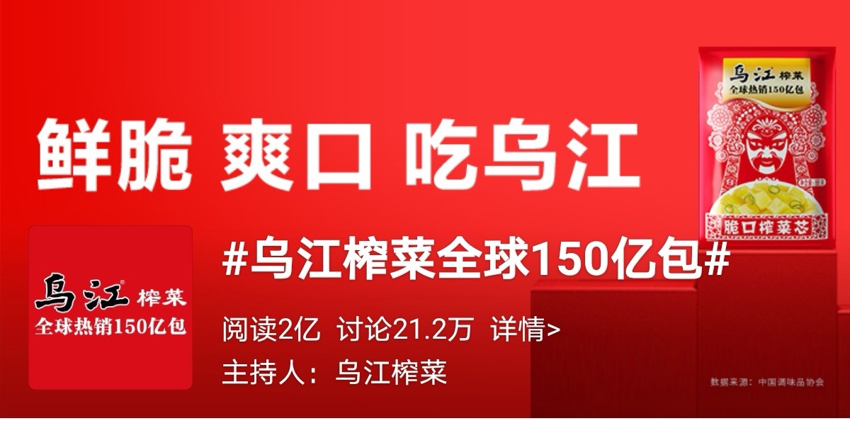 18日,重庆市涪陵榨菜集团股份有限公司(涪陵榨菜.002507.SZ)在其官方微博披露称,因乌江榨菜全球热销150亿包将于今日开粉丝会直播的信息,#乌江榨菜全球热销150亿包#瞬登微博热搜榜,1.8亿人阅读了此话题,202万人参与了讨论。