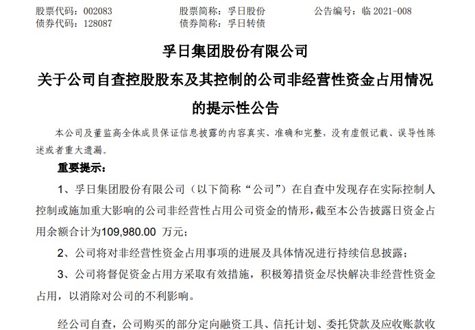 公告显示,孚日股份自查发现,其公司购买的部分理财产品,最终资金使用方为实际控制人控制或施加重大影响的公司,且该理财产品在去年9月15日,华荣实业成为公司的控股股东及高密市国有资产运营中心成为公司实际控制人后,仍在存续期且尚未偿还,事实上构成了控股股东、实际控制人及其关联方被动占用公司的资金10.998亿元。