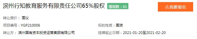 20日,滨州国有资本投资运营集团有限公司(简称“滨州国投集团”)披露称,拟转让65%股权,支持旗下全资子公司滨州行知教育服务有限责任公司(简称“行知教育”)混改,目前转让价未定,预披露时间为1月20日至2月20日。目前,行知教育欲混改的信息,已有61人在山东产权交易中心围观。