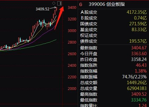 今日早盘,市场在走低后快速拉起,A股三大指数全线走强,上证指数涨0.56%站稳3600点,深证成指、创业板指数再创新高,分别涨1.15%、1.38%,创业板指数站上3400点。创业板指数连拉4根大阳线。