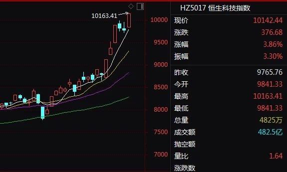 恒生科技指数一度暴涨超4%,南下资金达到120亿元。