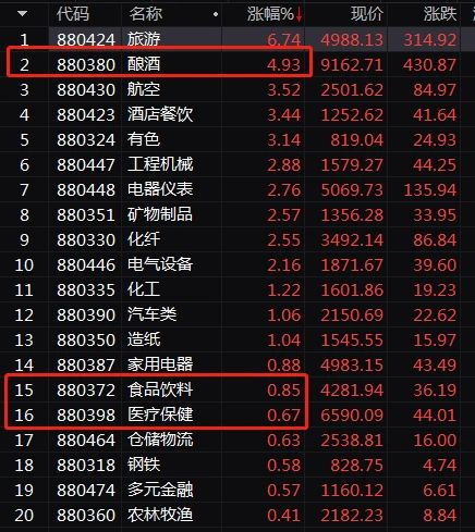 板块方面,大消费的酿酒、食品饮料、家电,以及医疗、有色等涨幅靠前。酿酒板块大涨近5%。地产、银行、互联网等逆势下跌。