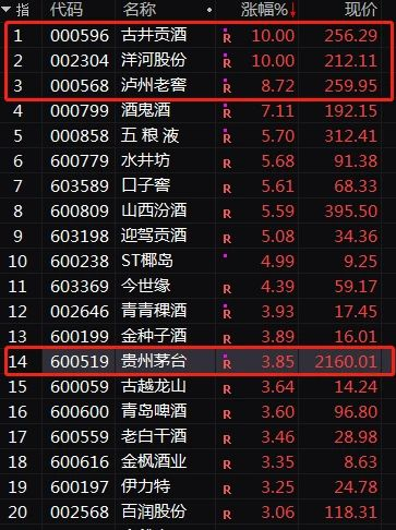 贵州茅台大涨3.85%,五粮液、泸州老窖大涨5.7%、8.72%,洋河股份、古井贡酒更是涨停。