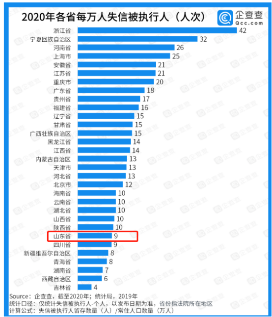 此外,企查查还统计了各省份失信密度,企查查将各省份的失信被执行人现存数量除以常住人口数量,得到各省份每万人失信被执行人数量,并将此定义为“失信密度”,浙江、宁夏、河南是“失信密度”最高的三个省份。其中,山东每万人有9个失信被执行人,“失信密度”排名靠后,与四川省并列,排名在第25位。