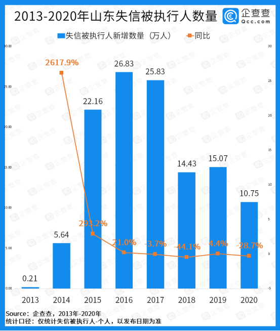 日前,企查查大数据研究院推出《2020年失信被执行人风险数据报告》,显示2020年全国新增失信被执行人249.84万,同比下降15.6%,其中,山东新增10.75万人次,全国排名第六。