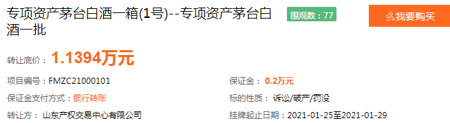 25日,山东产权交易中心公告称,拟将55箱飞天茅台被作为罚没资产进行拍卖,起拍价为1.1394万元/箱,挂牌期为1月25日至29日。据悉,这批茅台出厂日期为2016年,存在发票、凭证等法律文件不全的情形。