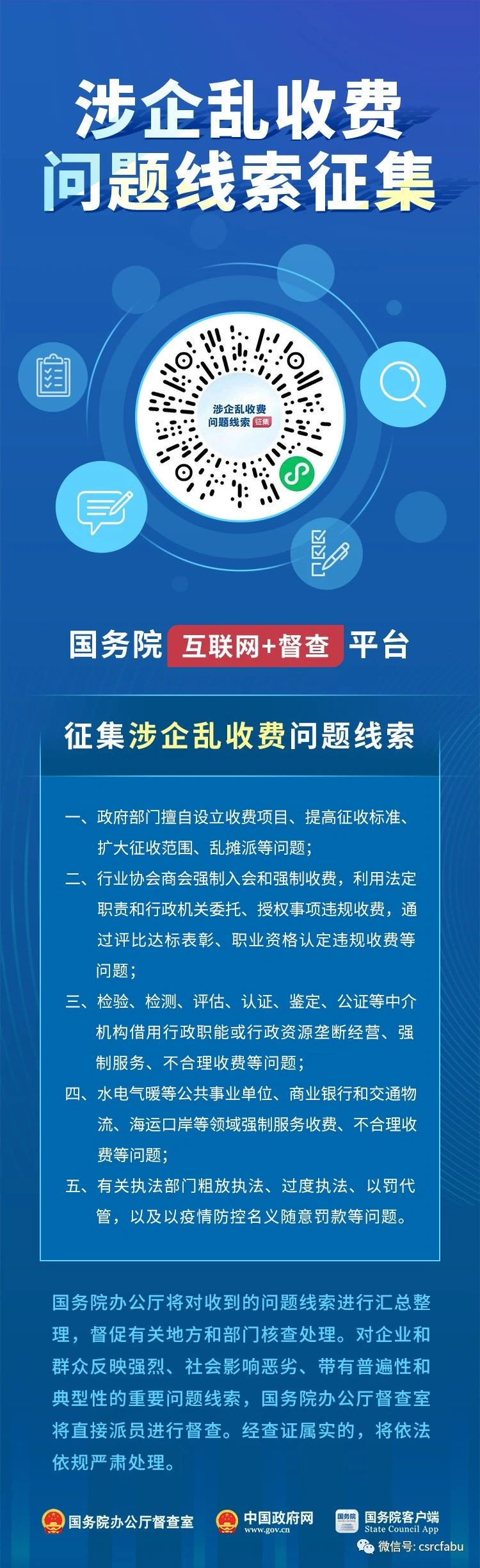 为贯彻落实党中央、国务院关于减税降费的重大决策部署,坚决制止涉企乱收费,切实减轻企业和群众不合理负担,更大激发市场主体活力,根据有关工作部署,国务院“互联网+督查”平台从1月26日起面向社会征集涉企乱收费的问题线索。
