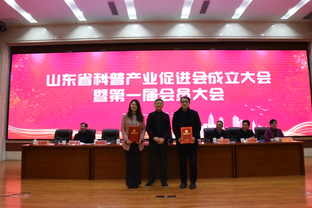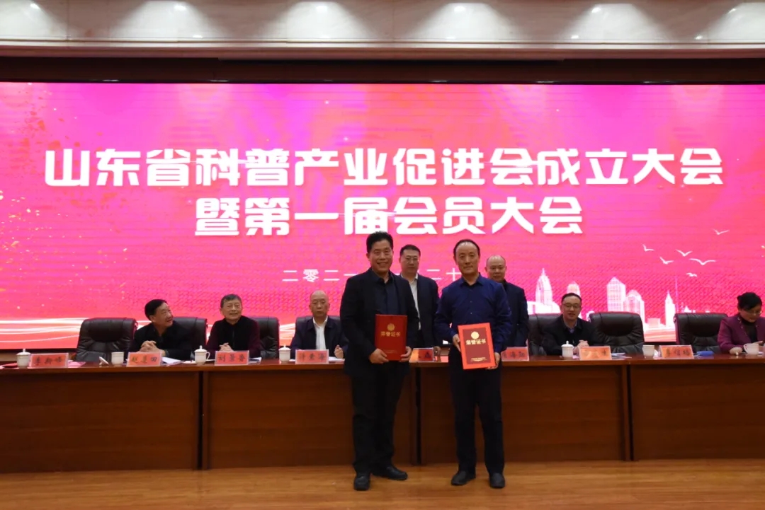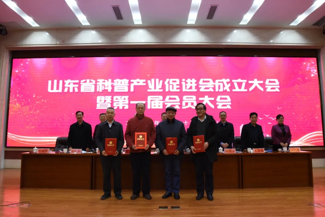 省民政厅社会组织管理局副处长王又磊、省科技厅引进引进智力与出国培训管理处处长庄海勋、民盟省委参政议政部副部长徐济生、省科协老领导许素海主席、首任山东省科普产业促进会会长李信培、副会长李新峰一起为山东省科普产业促进会揭牌。