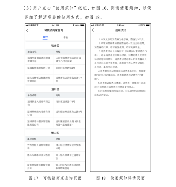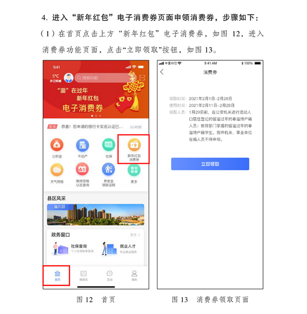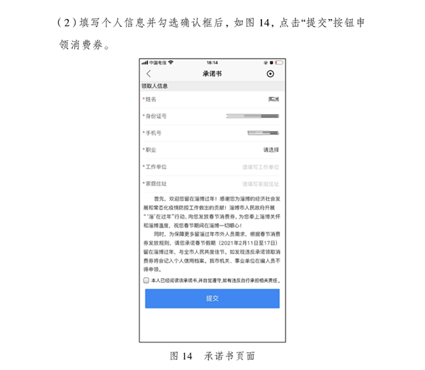 在活动规定时间内,已完成实名认证且符合领取条件的用户登录“爱山东·爱淄博”APP,填写工作单位、家庭住址等基本信息和留淄过年承诺书(用户承诺2月11日至2月17日在淄博过年,根据行程卡大数据比对后,如违反承诺领取消费券将会影响个人信用记录,并承担相关连带责任),提交申请后,系统根据用户身份证号自动生成显示消费者部分姓名、身份证号信息的电子消费券,用户可在“我的消费券”栏目下查询。用户领取消费券时,须在淄博市内,否则无法领取。