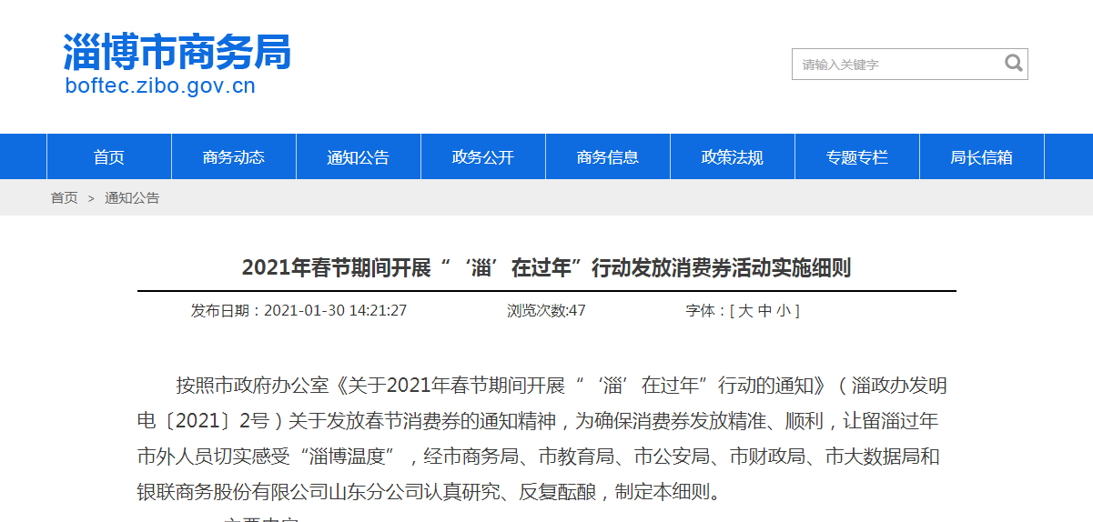 淄博市商务局负责按照有关规定选拔确定企业,组织企业节日期间开展正常营业,在做好疫情防控的前提下,积极参与消费券活动。指导银联商务股份有限公司山东分公司与参与企业签订合作协议,加强现场核销监测,及时发现处置相关技术及核销方面的问题。