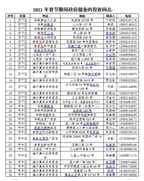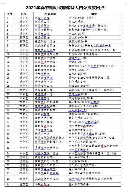鲁网·泰山财经记者注意到,猪肉投放网点主要为银座、华联、家家悦、大润发等我市主要连锁超市猪肉销售专柜、区县推荐的网点和承储企业维尔康集团直营店等,共计127个投放网点(具体投放网点附后);大白菜投放网点主要为上述主要连锁超市蔬菜销售专柜、区县推荐的网点等,共计140个投放网点。