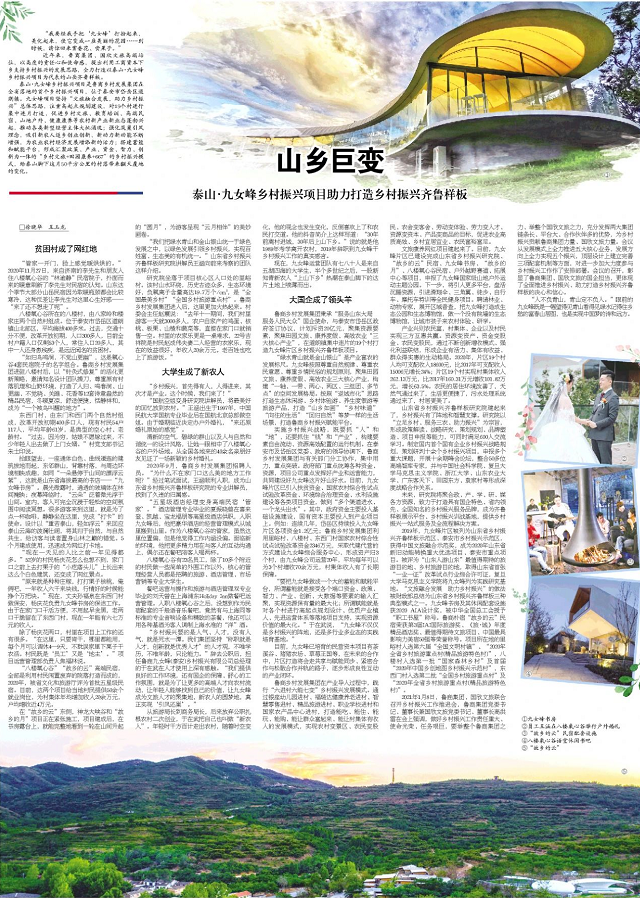 2月1日,大众日报第14版使用整个版面重量级报道了泰山·九女峰乡村振兴项目的发展情况,对鲁商集团、国欣文旅支持乡村振兴的责任心和使命感予以肯定,本号特此全文转发。
