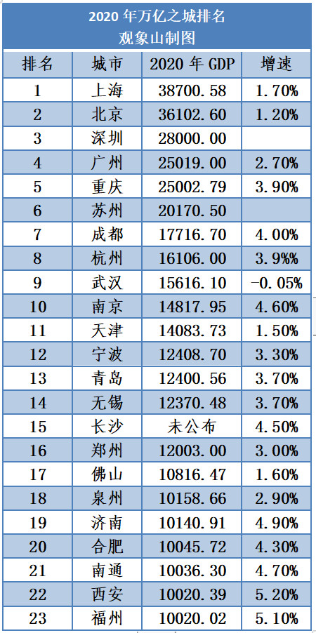 综上所述,在2020年城市GDP排行榜上,五城的排名基本揭晓:宁波列第12位,青岛列第13位(比2019年上升一位),无锡列第14位,长沙列第15位,郑州列第16位。