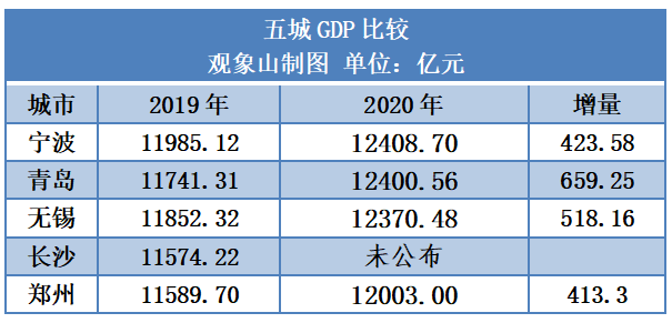 2020年,五城格局再调整,宁波、青岛、无锡、长沙、郑州的排序基本确定。