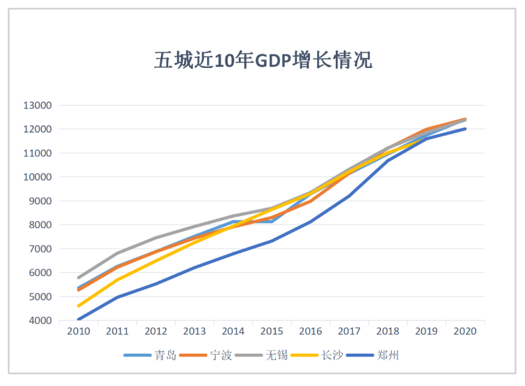 从近10年的GDP曲线可以清晰地看到,宁波、青岛、无锡、长沙、郑州五城GDP从4000亿元一路上扬,前后站上8个千亿元台阶,到2019年,纷纷达到“11000亿元+”。