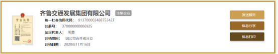 鲁网·泰山财经记者在国家企业信用信息公示系统发现,目前齐鲁交通为注销企业,注销时间为2020年11月16日,注销原因为因公司合并或分立。