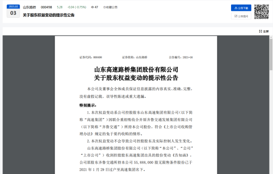 3日,山东高速路桥集团股份有限公司(山东路桥.00498.SZ)发布关于股东权益变动的提示性公告,称公司原股东齐鲁交通发展集团有限公司(以下简称“齐鲁交通”)所持本公司5588.8万股无限售条件股份已于2021年1月29日过户至山东高速集团有限公司(以下简称“山东高速集团”)名下。