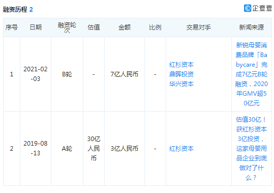 据悉,BabycareB轮融资共7亿元,由鼎晖投资领投,华兴资本旗下华兴新经济基金、A轮股东红杉资本中国基金跟投,华兴资本担任本轮融资的独家财务顾问。企查查显示,2019年8月时,该企业曾获红杉资本投资3亿元,估值30亿。