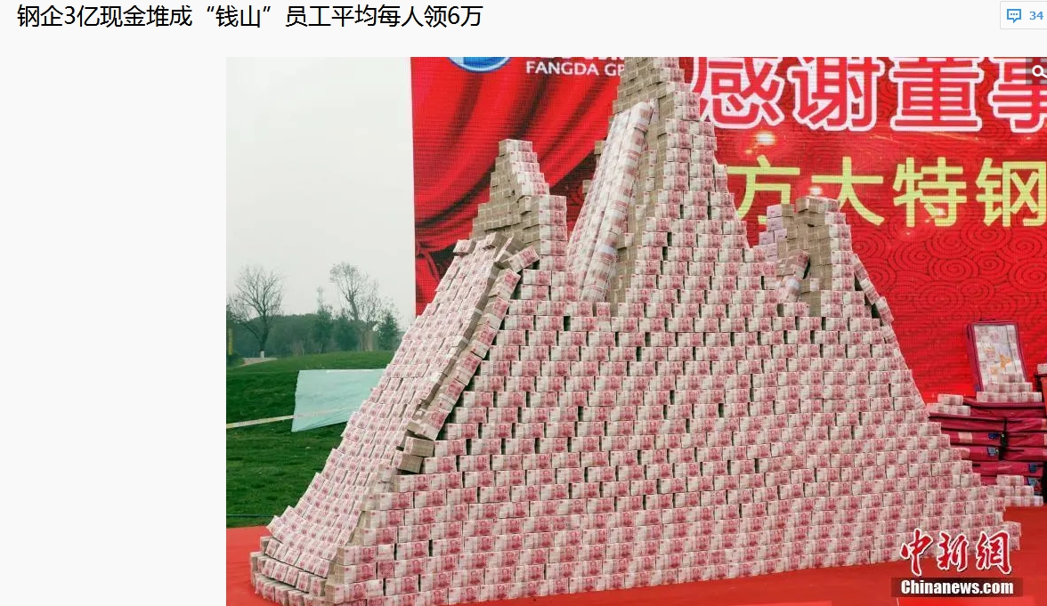 更有直接砸现金的!2019年1月19日,江西南昌市方大特钢厂区内,3亿多元现金堆成一座“钱山”,为员工发放年终奖。该企业共有5000余名员工,每人平均可以领取到6万元年终奖。