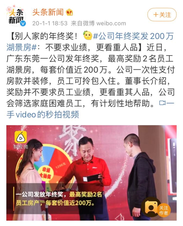 一到发年终奖的时候,总有一些“土豪”企业从不会让人失望。记得去年,广东东莞一企业年终奖直接就送了200万的湖景房!下面鲁网·泰山财经记者就为大家盘点一下近年来各式的“豪横”企业,年终奖发起来也是一点都不手软。