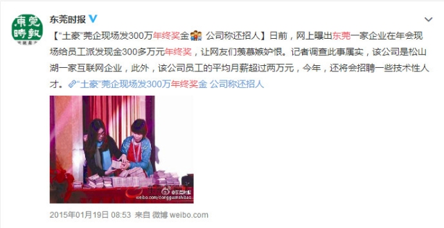 2015年,网上曝出东莞一家企业在年会现场给员工派发现金300多万元年终奖。 鲁网·泰山财经记者 王雅茜