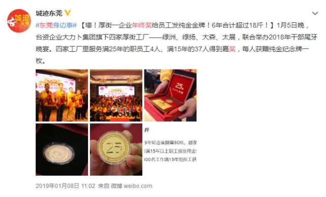 有送金子的!2019年东莞厚街一企业年终奖,给员工发纯金金牌,6年合计超过18斤。