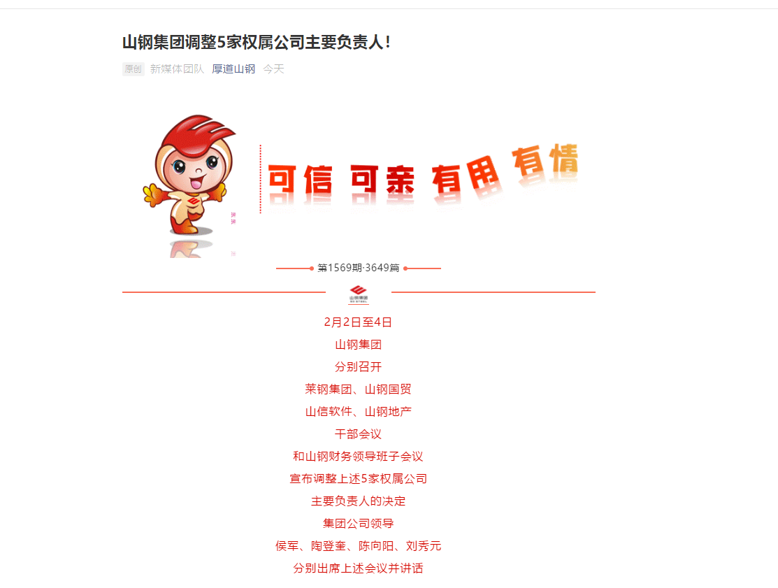 公告显示,2月2日至4日山钢集团分别召开莱芜钢铁集团有限公司(以下简称“莱钢集团”)、山东钢铁集团国际贸易有限公司(以下简称“山钢国贸”)、山信软件股份有限公司(以下简称“山信软件”)、山东钢铁集团房地产有限公司(以下简称“山钢地产”)干部会议和山东钢铁集团财务有限公司(以下简称“山钢财务”)领导班子会议宣布调整上述5家权属公司主要负责人的决定。