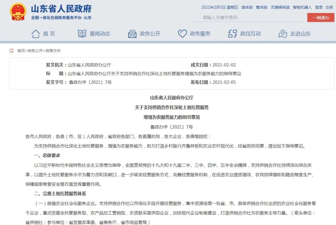 为支持供销合作社深化土地托管服务,增强为农服务能力,助力打造乡村振兴齐鲁样板和农业农村现代化,经省政府同意,提出如下指导意见。