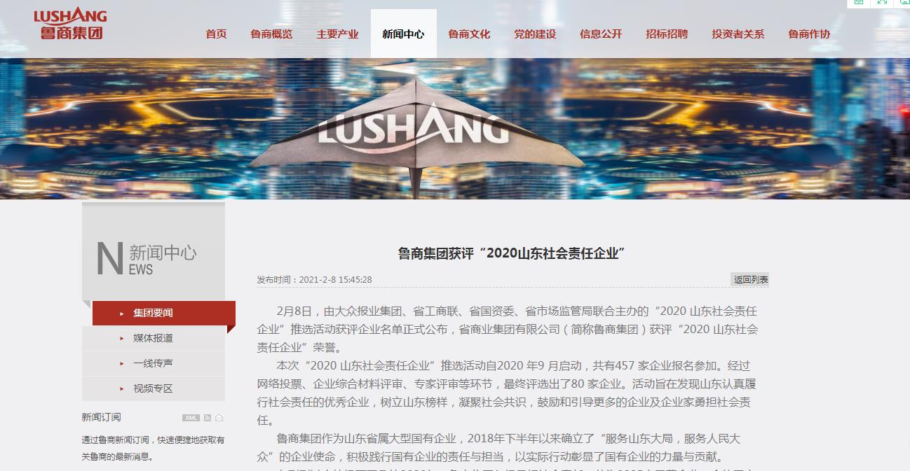 今日,鲁网·泰山财经记者从山东省商业集团有限公司(简称“鲁商集团”)官网获悉,2月8日,由大众报业集团、省工商联、省国资委、省市场监管局联合主办的“2020 山东社会责任企业”推选活动获评企业名单正式公布,鲁商集团获评“2020 山东社会责任企业”荣誉。