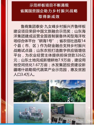 鲁商集团在助力乡村振兴战略上也取得了新成效。在山东省国资委发布山东省属国资国企2020年度亮点工作中,“鲁商集团泰安·九女峰乡村振兴齐鲁样板建设项目荣获中国文旅融合示范奖”在列。