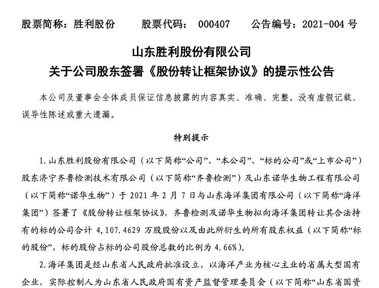 2月8日,胜利股份(000407)发布公告,公司股东齐鲁检测及诺华生物与山东海洋集团有限公司(以下简称“海洋集团”)签署了《股份转让框架协议》,齐鲁检测及诺华生物拟向海洋集团转让其合法持有的胜利股份合计4107.4629万股以及由此所衍生的所有股东权益。