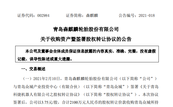 2月10日,森麒麟与青岛众城产业投资中心(有限合伙)(以下简称“青岛众城”)签署《关于青岛科捷机器人有限公司之股权转让协议》(以下简称“股权转让协议”),随后森麒麟宣布收购科捷机器人5.2744%的股权。