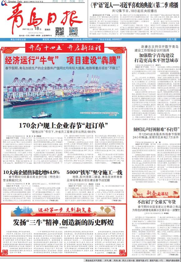 青岛日报今日刊发“迈好第一步 见到新气象”系列评论之一《发扬“三牛”精神,创造新的历史辉煌》。