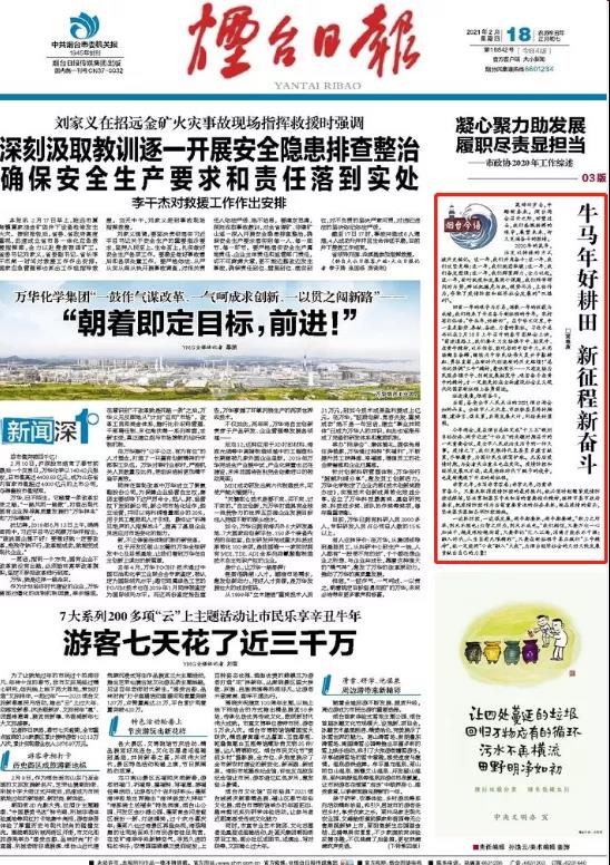 烟台日报“烟台今语”栏目刊发署名姜春康的评论《牛马年好耕田 新征程新奋斗》。评论指出,农村有句俗语:“牛马年,好耕田”。2021烟台“两会”如约而至,全体市人大代表、市政协委员将抒胸臆、建诤言、谋良策。疫情之下,更期待代表委员多建言献策,尽职履责,为国计民生保驾护航。尤其后疫情时期,与会者关注重点也在变化。疫情防控和经济发展双不误,这是特殊时代下赋予的使命,也是新境遇下开启的新征程。