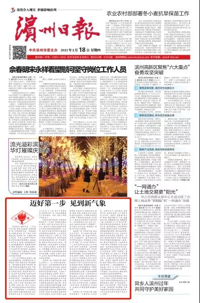 滨州日报刊发社论《迈好第一步 见到新气象》。评论指出,全市广大党员干部职工要立即结束春节假期模式,迅速进入工作状态,发扬“三牛”精神,全面开启现代化富强滨州建设新征程。评论指出,滨州市开启现代化富强滨州建设新征程,也进入高质量发展重要“窗口期”,干部群众思进思上思强、干事创业热情高涨,完全有信心、有能力在新阶段实现新作为。大家要有滨州人能、滨州人行、滨州人成的自信和底气,敢想敢干、勇于担当,咬定目标、砥砺前行,在奋斗中实现人生价值。