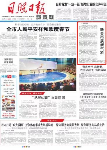 日照日报刊发评论员文章《新春再展新气象》。评论指出,今天是春节后的首个工作日,我们应“收心归位”、打起精神,在新春里再展新气象、实现新作为。评论指出,要大力实施生态立市、创新兴市、产业强市、开放活市战略,做到既为一域争光、也为全局添彩;对部署的工作、看准的事项、人民群众期盼的事情,就要说了算、定了干、马上办;始终保持精益求精的工作追求,敢于与最强者比拼,与最快者赛跑;要自觉增强学习充电的紧迫感,干什么学什么、缺什么补什么,努力成为各自领域、各自岗位的行家里手。要在“织密扎牢覆盖全生命周期的民生保障网”上持续用力、久久为功,让越来越多的群众真切感受到“生活在日照就是幸福”。要永远做忠诚的人民服务员,对就业、教育、医疗、住房等民生实事,要时时放在心上、事事抓在手上,努力让人民群众的笑容,成为这座城市最美的风景,努力开创现代化海滨城市建设新局面。