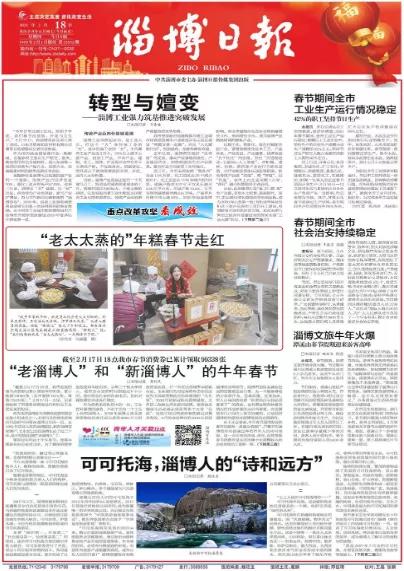 淄博日报头版头条刊发《转型与嬗变——淄博工业强力筑基推进突破发展》,回顾过去三年来淄博从“老”破题,向“新”出发,推动传动产业优存量、新兴产业扩增量,奋力书写新旧动能转换的“淄博答卷”。另外,该报还在第七版转发新华社评论《牛开丰穗景 雨动辛丑春》。文中称,今年是巩固拓展脱贫攻坚成果同乡村振兴有效衔接的起步之年,这是当前和今后一个时期农村工作第一位的任务,春耕可以说是第一役,也是一个最好抓手。在这个乡村振兴的春天,一定能够“春种一粒粟,秋收万颗子”。