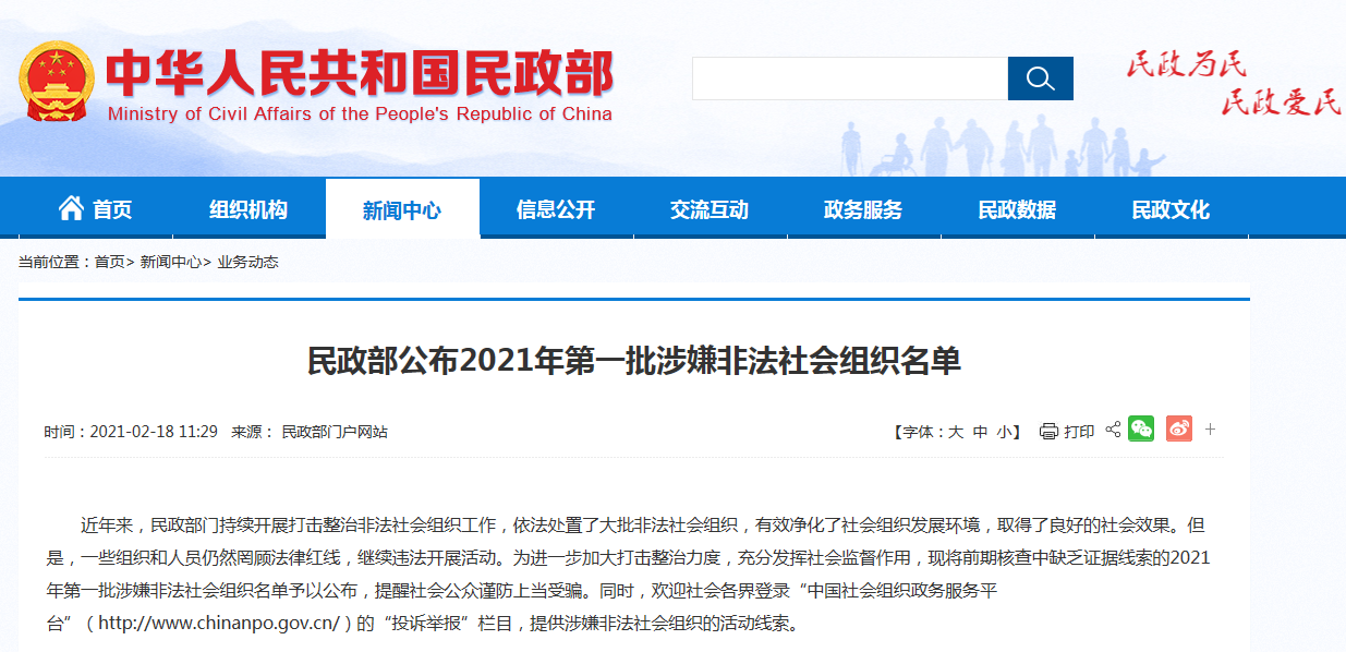 据了解,近年来,民政部门持续开展打击整治非法社会组织工作,依法处置了大批非法社会组织,有效净化了社会组织发展环境,取得了良好的社会效果。但是,一些组织和人员仍然罔顾法律红线,继续违法开展活动。为进一步加大打击整治力度,充分发挥社会监督作用,民政部现将前期核查中缺乏证据线索的2021年第一批涉嫌非法社会组织名单予以公布,提醒社会公众谨防上当受骗。