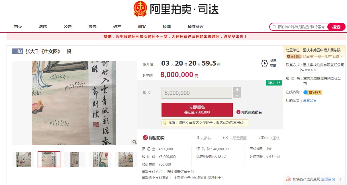 近日,重庆市第五中级人民法院(以下简称“重庆五中院”)在阿里拍卖披露,拟以800万元起拍价公开拍卖一幅张大千《仕女图》,但法院对该画作真伪难以鉴定,存有真伪风险。对此,重庆五中院一名罗姓工作人员回应鲁网·泰山财经记者,“当事人资金无法支持鉴定,法院也无相关义务。”