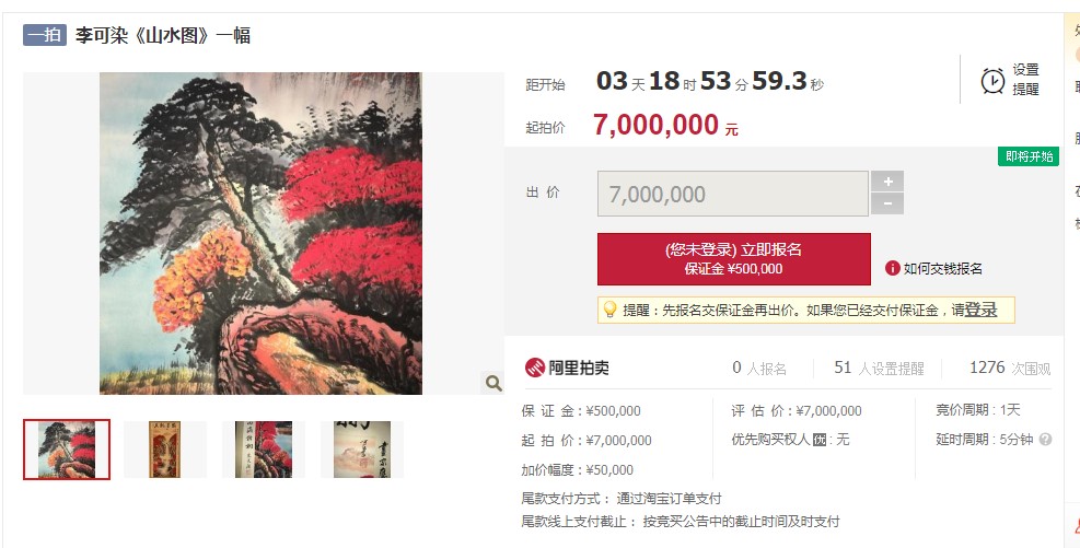 鲁网·泰山财经记者在阿里拍卖平台注意到,该被执行人同时还拍卖了另一幅李可染的《山水图》,起拍价为700万元,目前该项目已吸引1276人围观,51人设置了开拍提醒,该画也无法提供真伪鉴定。据集成拍卖工作人员表示,这幅《山水图》目前也还无人预约实地看样。