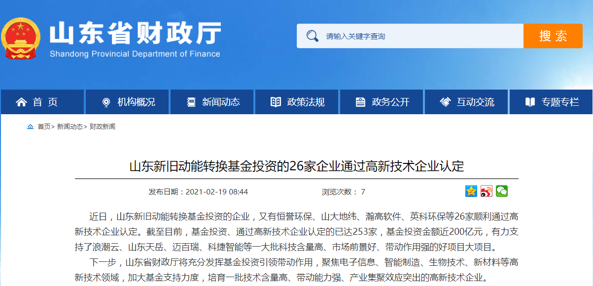 鲁网·泰山财经记者从山东省财政厅获悉,近日,山东新旧动能转换基金投资的企业,又有恒誉环保、山大地纬、瀚高软件、英科环保等26家顺利通过高新技术企业认定。