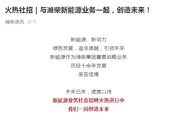 鲁网·泰山财经记者梳理发现,在去年9月、今年1月的两次校园招聘中,潍柴集团共计划招募2200名校园人才,均涵盖新能源业务相关人才招募,不少网友在其微信平台留言,“希望加入潍柴大家庭。”