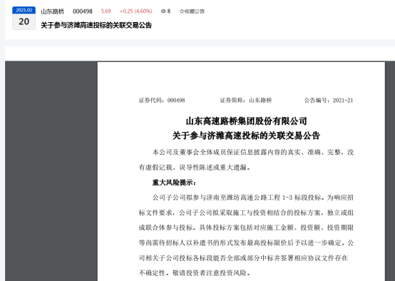 此外,鲁网·泰山财经记者注意到,本项目招标人建设管理公司为山东路桥控股股东山东高速集团有限公司分公司,为山东路桥关联方,本次投标构成关联交易。