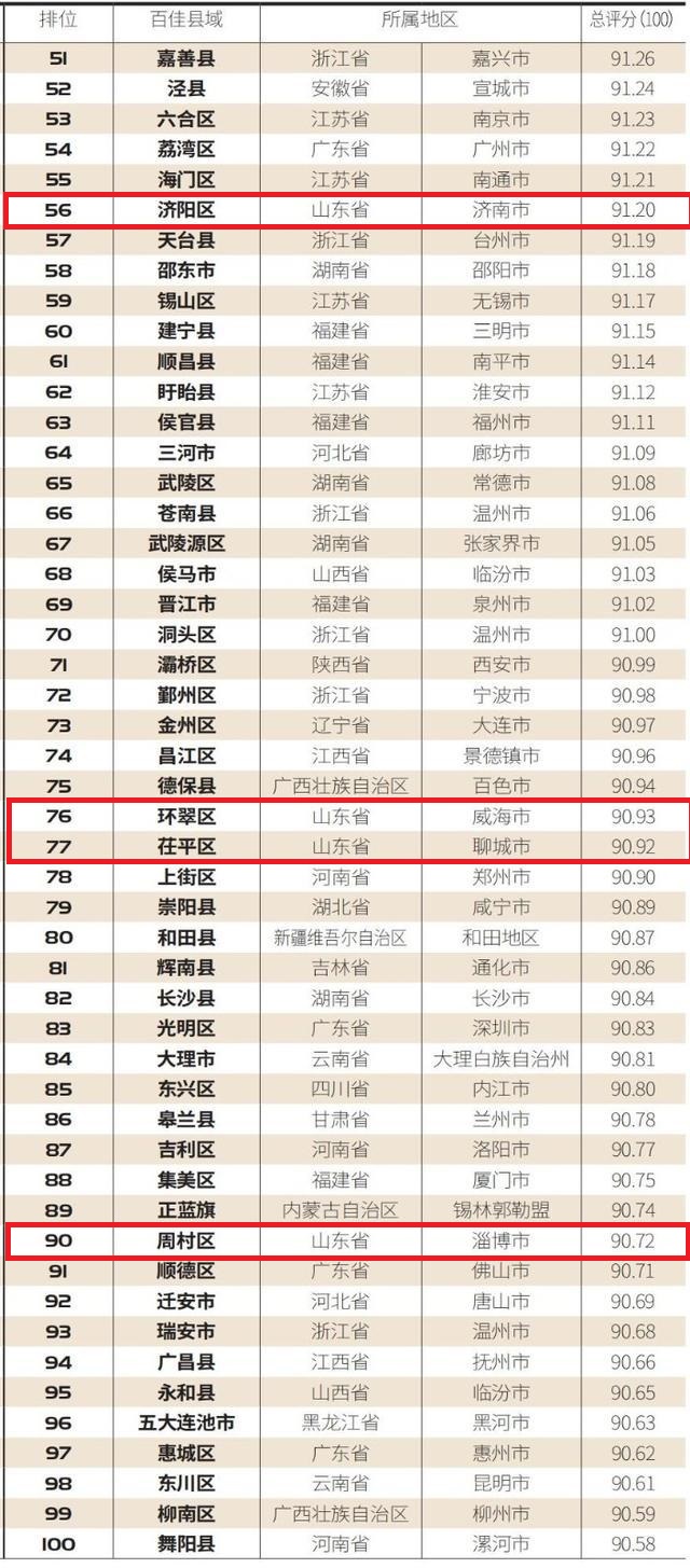山东其余4个县域分别为:济南市济阳区、威海市环翠区、聊城市茌平区、淄博市周村区,评分依次为91.20、90.93、90.92、90.72,分别排在全国56、76、77、90位。从地市划分来看,济南有2个,滨州、菏泽、威海、聊城、淄博各一个。(鲁网·泰山财经记者 徐文轩)