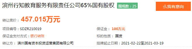 今日,滨州国有资本投资运营集团有限公司(简称“滨州国投集团”)发布全资子公司欲混改的信息,公司通过山东产权交易所挂牌转让滨州行知教育服务有限责任公司(简称“行知教育”)65%股权,转让价为457.015万元,转让时间为2月22日至3月19日。