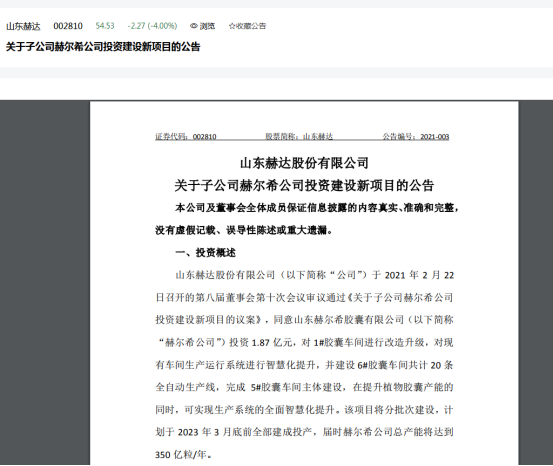 公告显示,山东赫达于2021年2月22日召开的第八届董事会第十次会议审议通过《关于子公司赫尔希公司投资建设新项目的议案》,同意赫尔希公司投资 1.87 亿元,对1#胶囊车间进行改造升级,对现有车间生产运行系统进行智慧化提升,并建设6#胶囊车间共计20条全自动生产线,完成5#胶囊车间主体建设,在提升植物胶囊产能的同时,可实现生产系统的全面智慧化提升。
