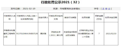鲁网·泰山财经记者近日从济南市城管局网站获悉,济南银丰科耀建筑工程有限公司在施工地平西棠甲第D地块项目室外景观、官网工程时违反了扬尘污染防治有关规定。具体为表现为:1、施工现场大量裸土未覆盖;2、土方施工未采取降尘喷淋措施;3、场内建筑垃圾未及时清理,道路积尘较多。上述行为违反了《济南市扬尘污染防治管理规定》第十三条第三、四、六项规定。2月10日,济南市城管局(市综合行政执法局)对济南银丰科耀建筑工程有限公司做出处罚决定,依据《济南市扬尘污染防治管理规定》第二十四条,对其罚款7万元。